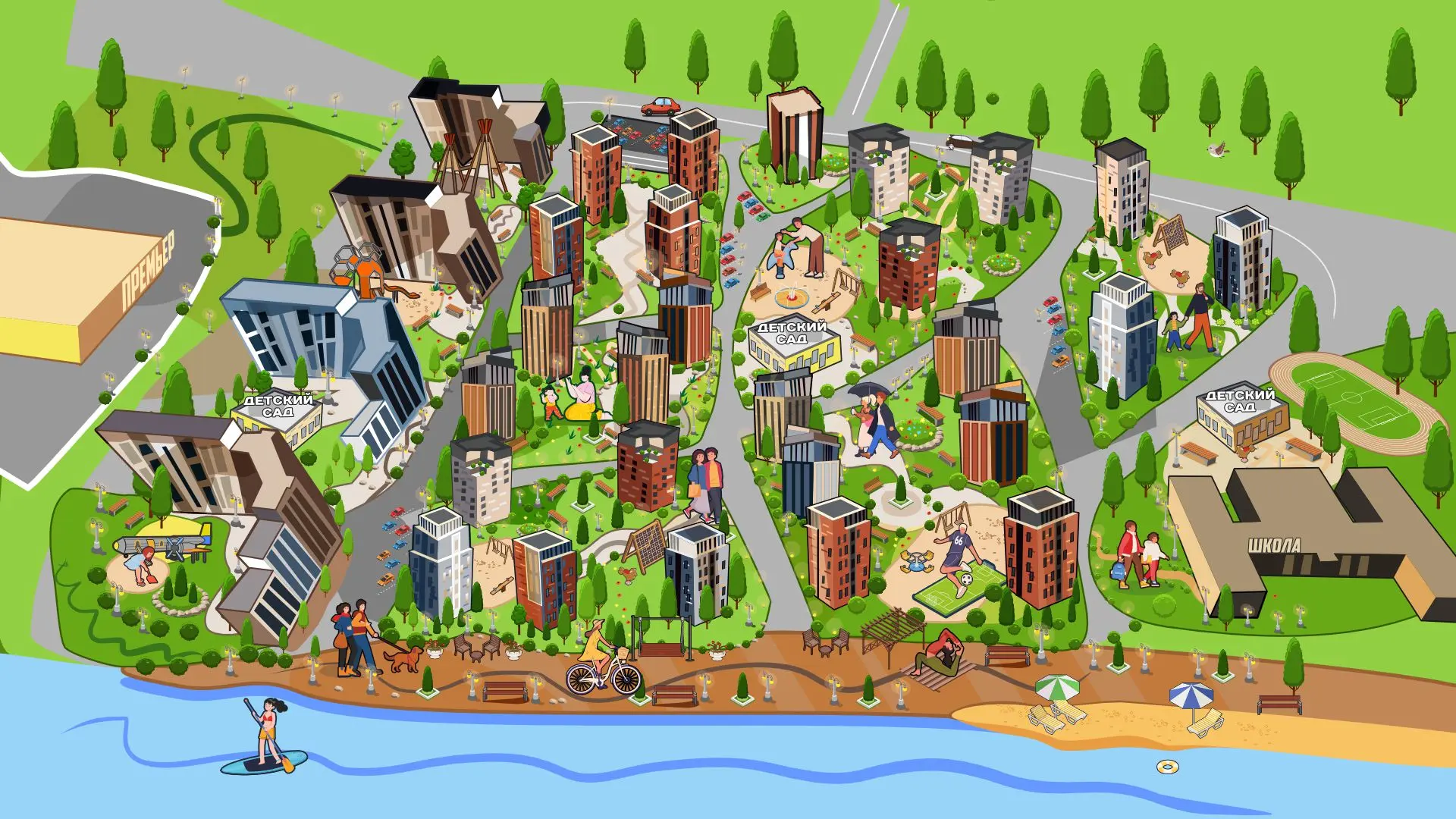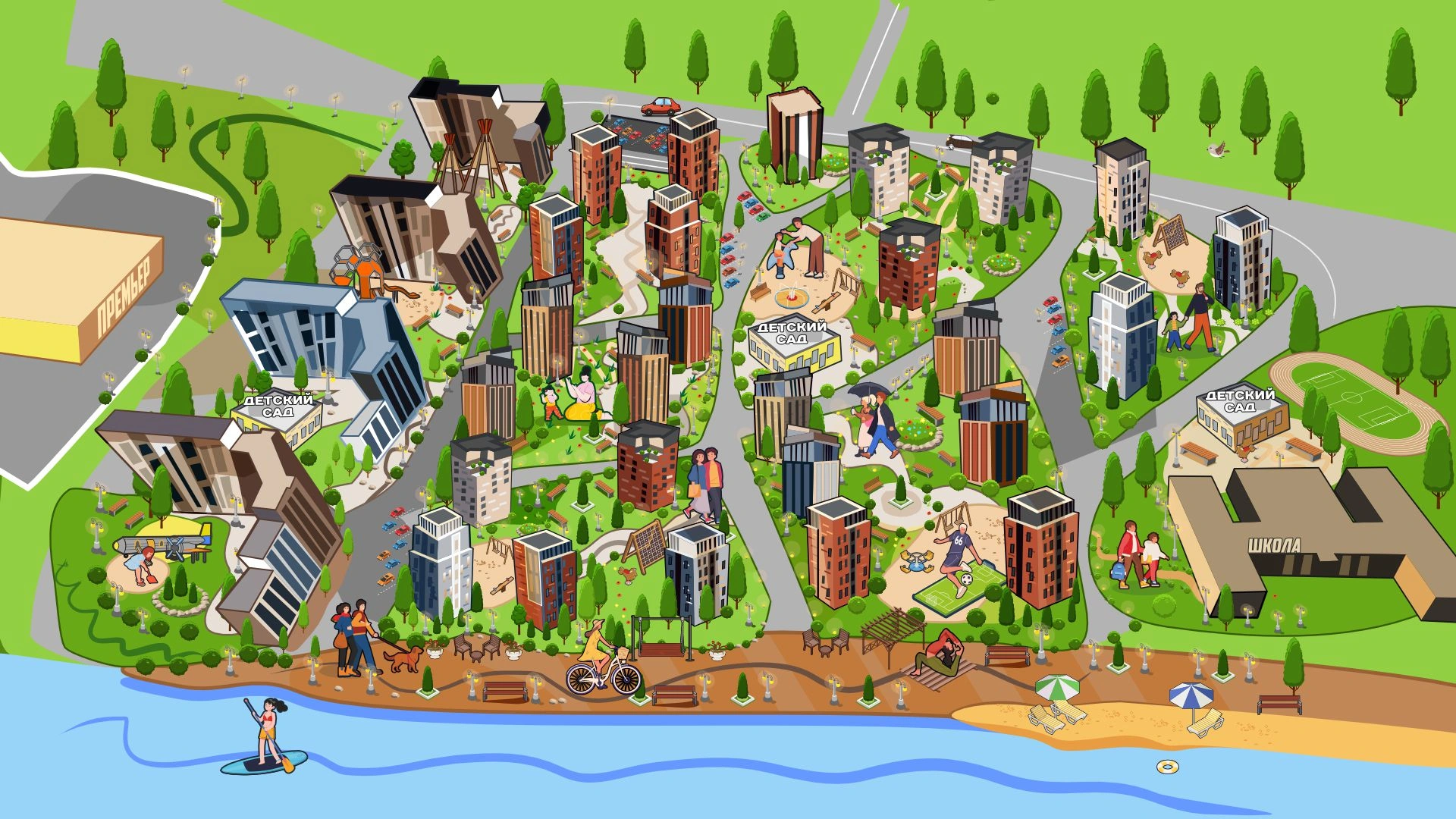Набережная вдоль реки, зелёные дворы, спортивные